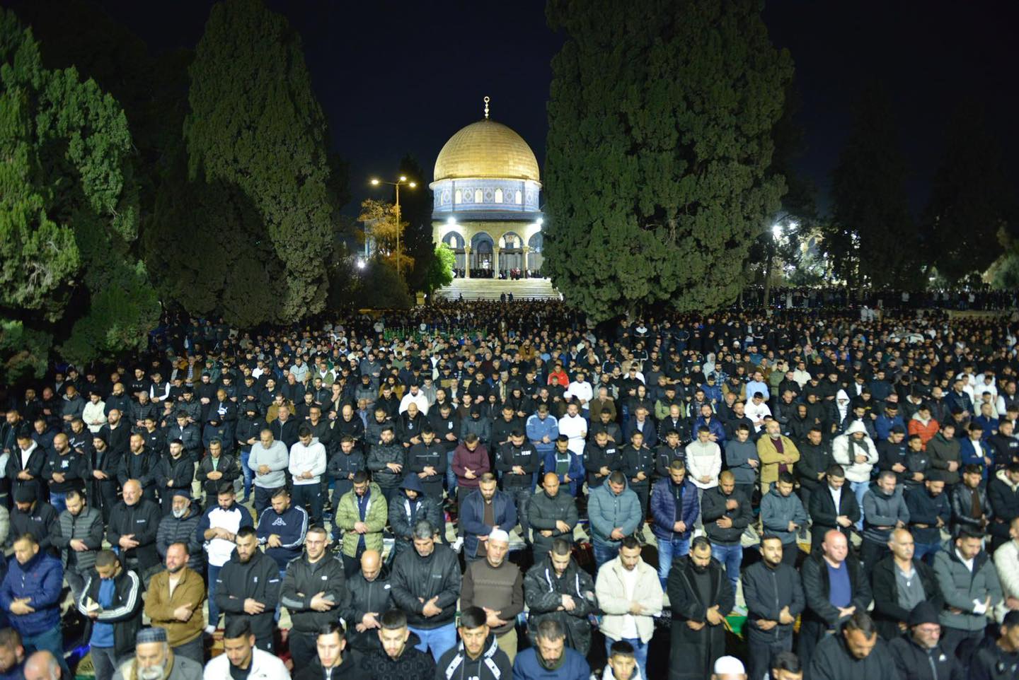 OCCUPIED JERUSALEM, (Palestine Foundation Information Center), Around 100,000 worshippers performed the Isha and Taraweeh prayers on Friday evening at Aqsa Mosque in Occupied Jerusalem, despite strict military measures imposed by Israeli forces at the Mosque’s entrances and surrounding areas.